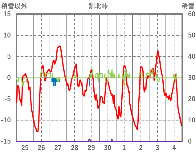 | 日 | 時 | 気温 | 降水 | 風向/風速 | 日照 | 積雪 | 降雪 |