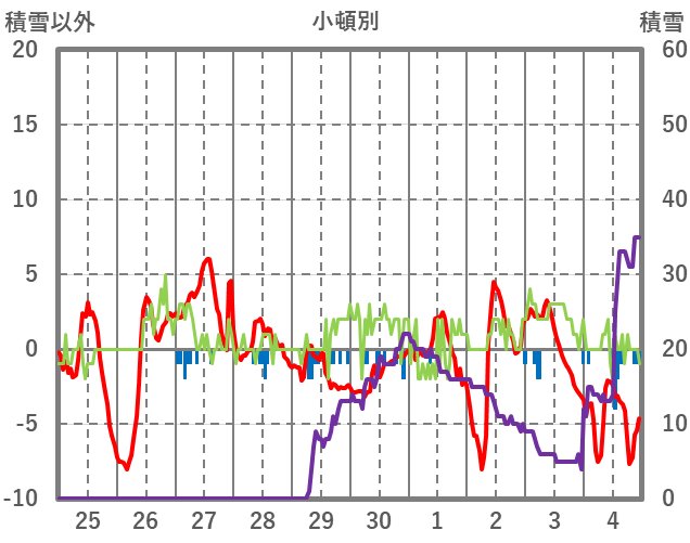 | 日 | 時 | 気温 | 降水 | 風向/風速 | 日照 | 積雪 | 降雪 |