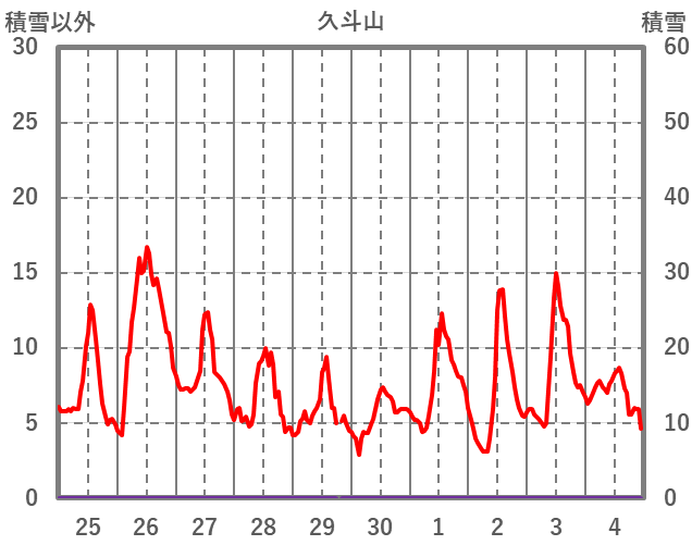 | 日 | 時 | 気温 | 降水 | 風向/風速 | 日照 | 積雪 | 降雪 |