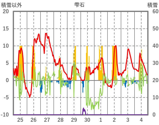 | 日 | 時 | 気温 | 降水 | 風向/風速 | 日照 | 積雪 | 降雪 |