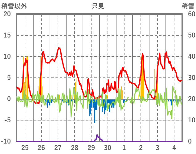 | 日 | 時 | 気温 | 降水 | 風向/風速 | 日照 | 積雪 | 降雪 |
