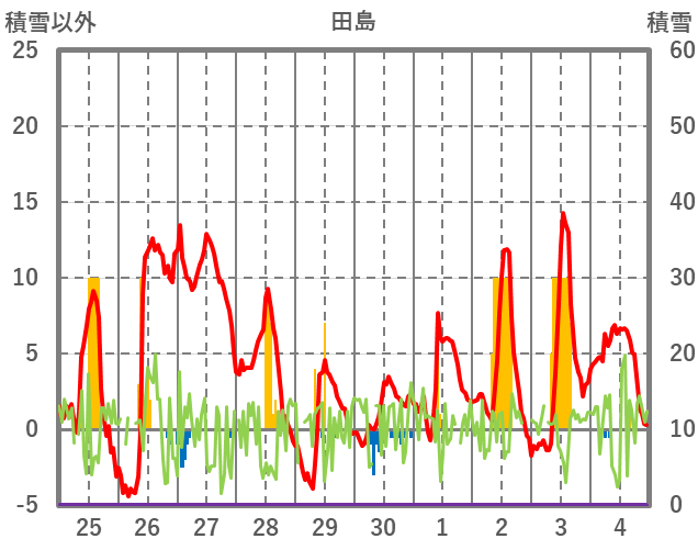 | 日 | 時 | 気温 | 降水 | 風向/風速 | 日照 | 積雪 | 降雪 |