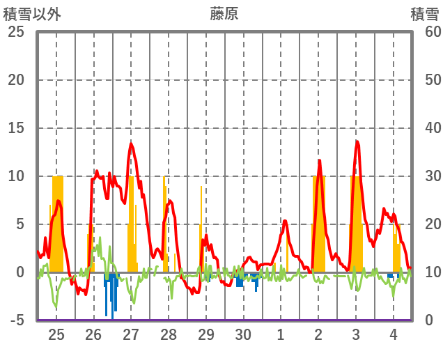 | 日 | 時 | 気温 | 降水 | 風向/風速 | 日照 | 積雪 | 降雪 |