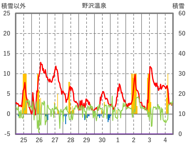 | 日 | 時 | 気温 | 降水 | 風向/風速 | 日照 | 積雪 | 降雪 |