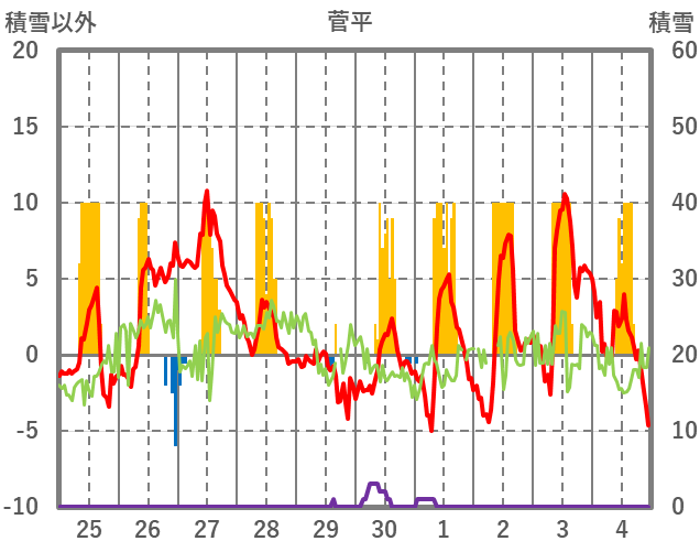 | 日 | 時 | 気温 | 降水 | 風向/風速 | 日照 | 積雪 | 降雪 |