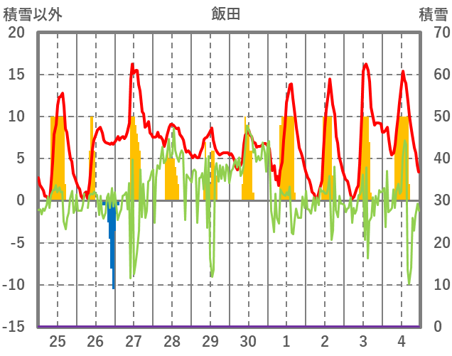 | 日 | 時 | 気温 | 降水 | 風向/風速 | 日照 | 積雪 | 降雪 |