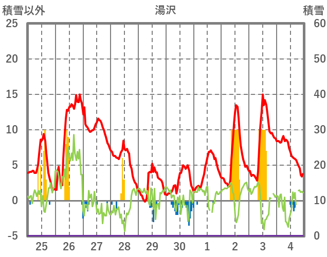 | 日 | 時 | 気温 | 降水 | 風向/風速 | 日照 | 積雪 | 降雪 |