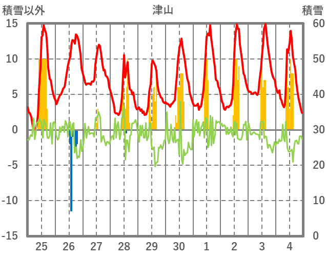 | 日 | 時 | 気温 | 降水 | 風向/風速 | 日照 | 積雪 | 降雪 |