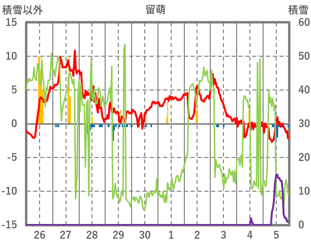 | 日 | 時 | 気温 | 降水 | 風向/風速 | 日照 | 積雪 | 降雪 |
