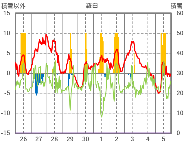 | 日 | 時 | 気温 | 降水 | 風向/風速 | 日照 | 積雪 | 降雪 |