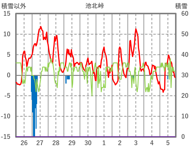 | 日 | 時 | 気温 | 降水 | 風向/風速 | 日照 | 積雪 | 降雪 |