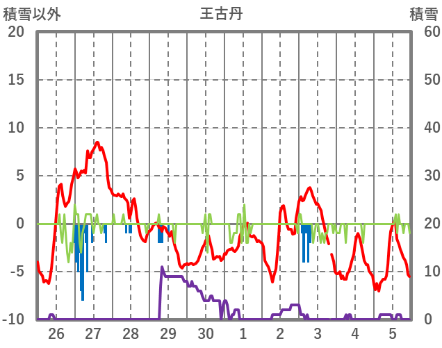 | 日 | 時 | 気温 | 降水 | 風向/風速 | 日照 | 積雪 | 降雪 |