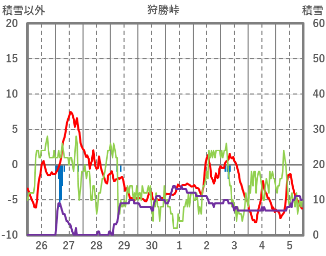 | 日 | 時 | 気温 | 降水 | 風向/風速 | 日照 | 積雪 | 降雪 |
