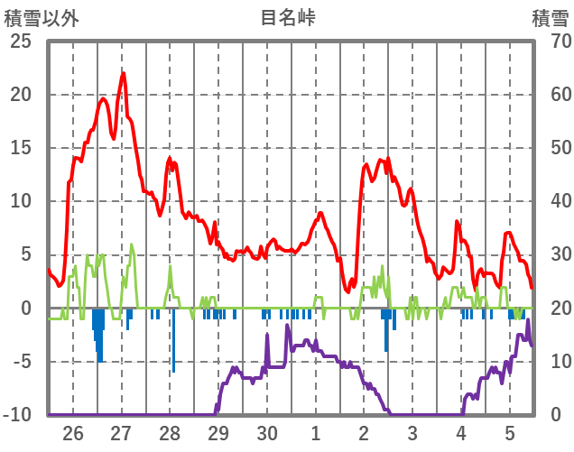 | 日 | 時 | 気温 | 降水 | 風向/風速 | 日照 | 積雪 | 降雪 |