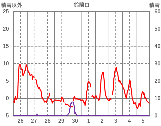 | 日 | 時 | 気温 | 降水 | 風向/風速 | 日照 | 積雪 | 降雪 |