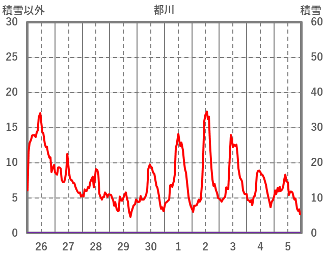 | 日 | 時 | 気温 | 降水 | 風向/風速 | 日照 | 積雪 | 降雪 |