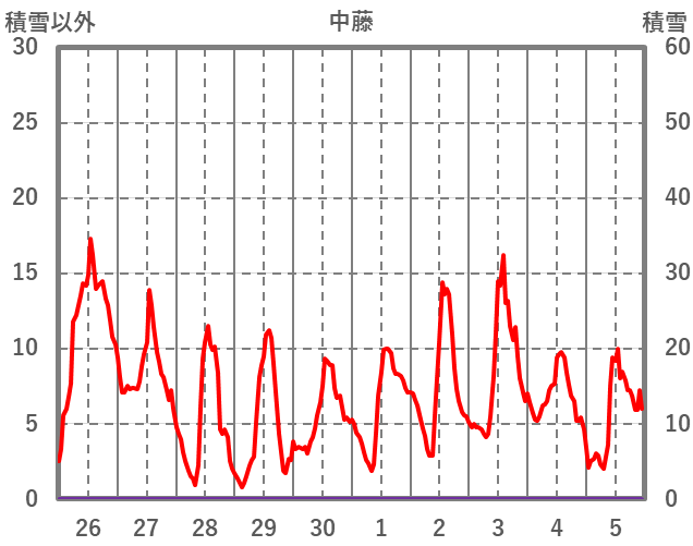 | 日 | 時 | 気温 | 降水 | 風向/風速 | 日照 | 積雪 | 降雪 |