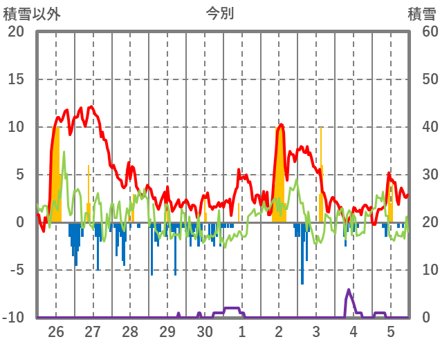 | 日 | 時 | 気温 | 降水 | 風向/風速 | 日照 | 積雪 | 降雪 |