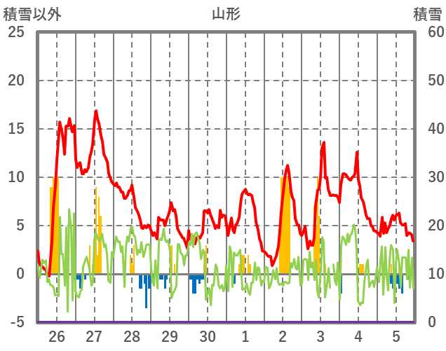 | 日 | 時 | 気温 | 降水 | 風向/風速 | 日照 | 積雪 | 降雪 |