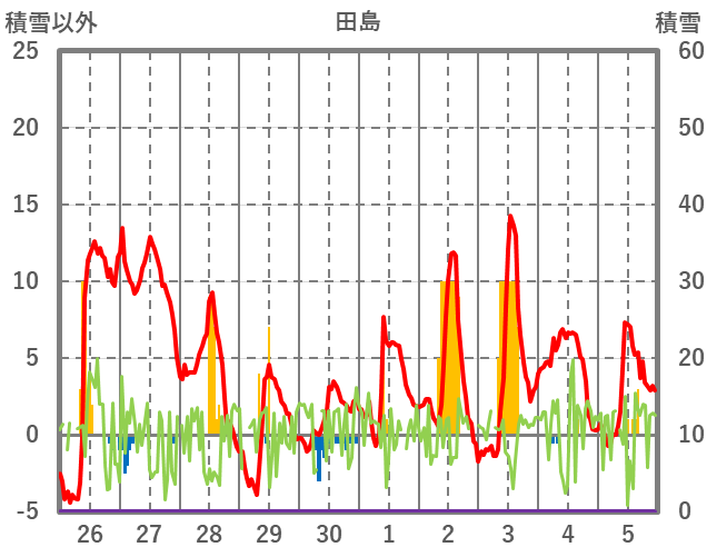 | 日 | 時 | 気温 | 降水 | 風向/風速 | 日照 | 積雪 | 降雪 |