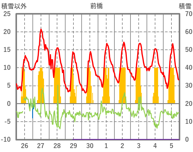 | 日 | 時 | 気温 | 降水 | 風向/風速 | 日照 | 積雪 | 降雪 |