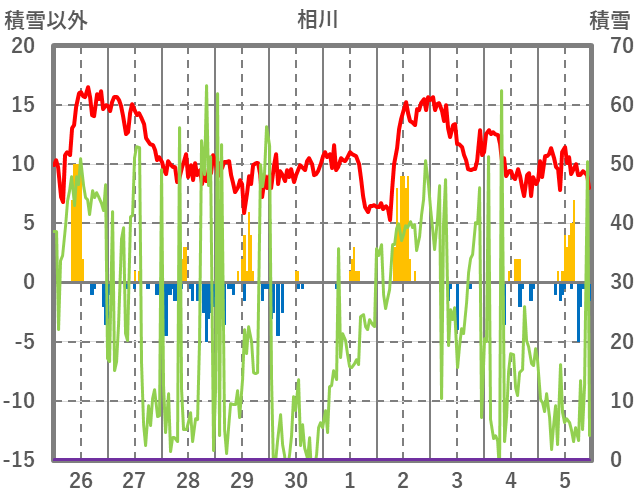 | 日 | 時 | 気温 | 降水 | 風向/風速 | 日照 | 積雪 | 降雪 |