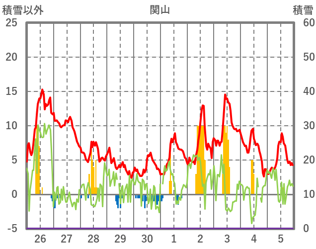 | 日 | 時 | 気温 | 降水 | 風向/風速 | 日照 | 積雪 | 降雪 |