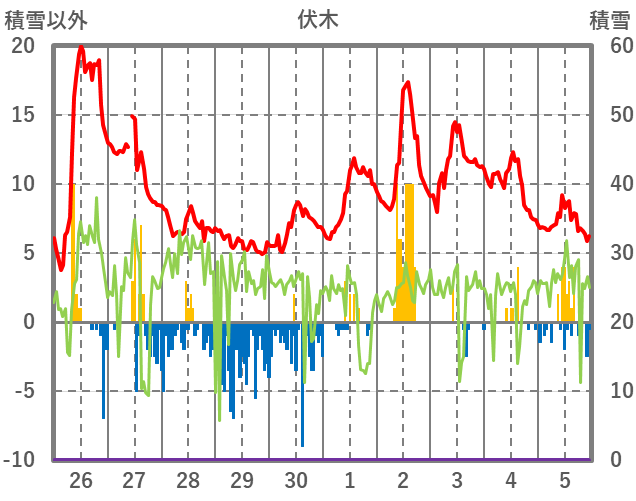 | 日 | 時 | 気温 | 降水 | 風向/風速 | 日照 | 積雪 | 降雪 |