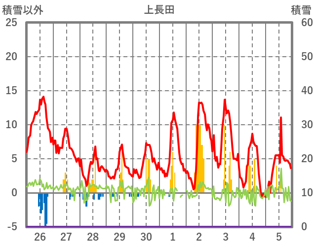 | 日 | 時 | 気温 | 降水 | 風向/風速 | 日照 | 積雪 | 降雪 |