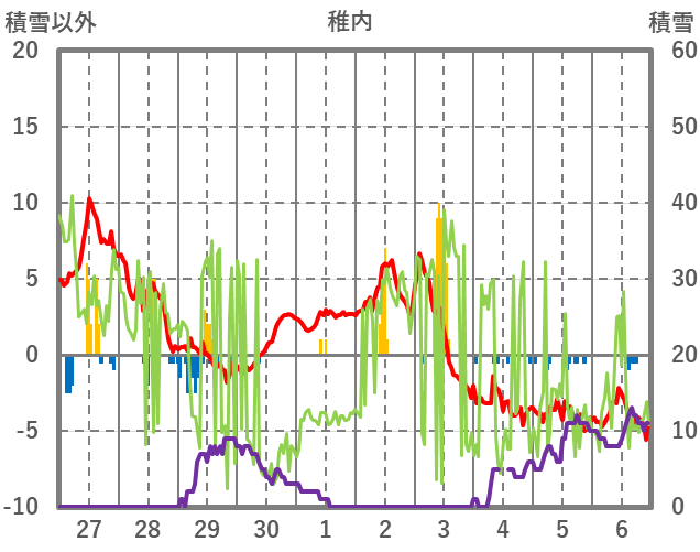 | 日 | 時 | 気温 | 降水 | 風向/風速 | 日照 | 積雪 | 降雪 |