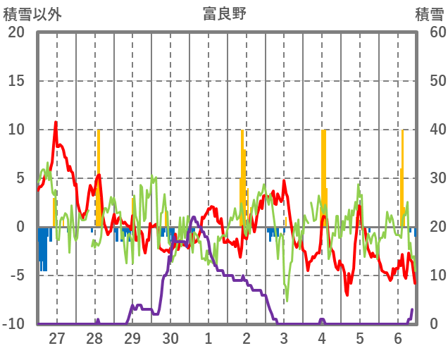 | 日 | 時 | 気温 | 降水 | 風向/風速 | 日照 | 積雪 | 降雪 |