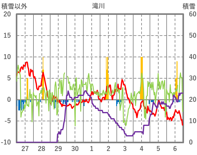 | 日 | 時 | 気温 | 降水 | 風向/風速 | 日照 | 積雪 | 降雪 |