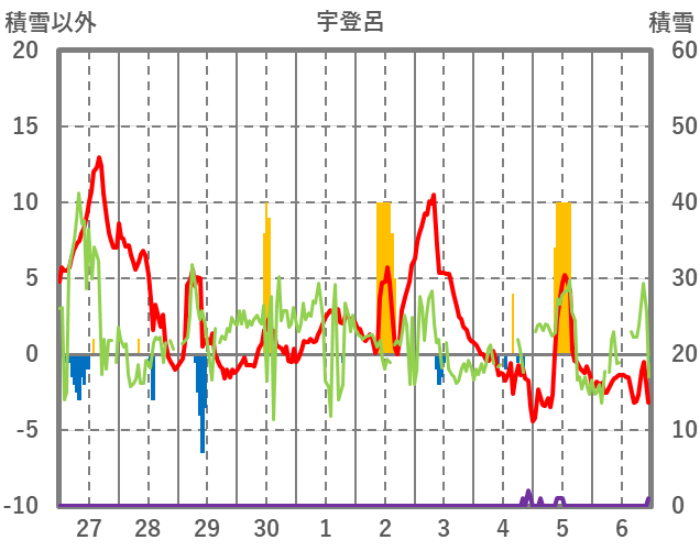 | 日 | 時 | 気温 | 降水 | 風向/風速 | 日照 | 積雪 | 降雪 |