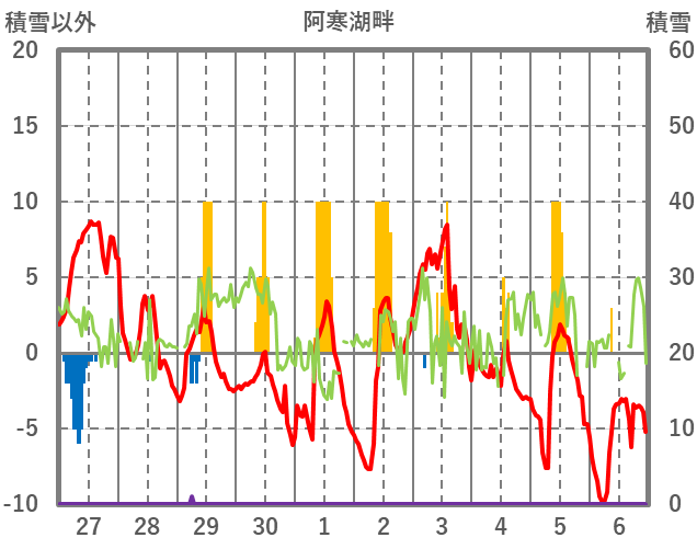 | 日 | 時 | 気温 | 降水 | 風向/風速 | 日照 | 積雪 | 降雪 |