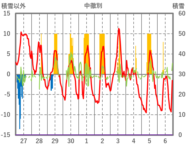 | 日 | 時 | 気温 | 降水 | 風向/風速 | 日照 | 積雪 | 降雪 |