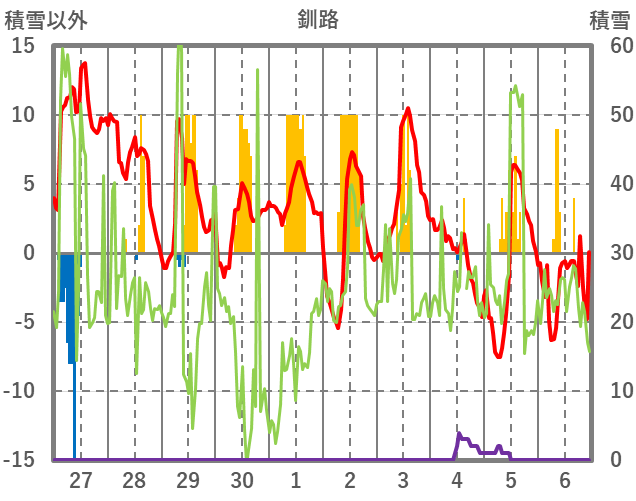 | 日 | 時 | 気温 | 降水 | 風向/風速 | 日照 | 積雪 | 降雪 |