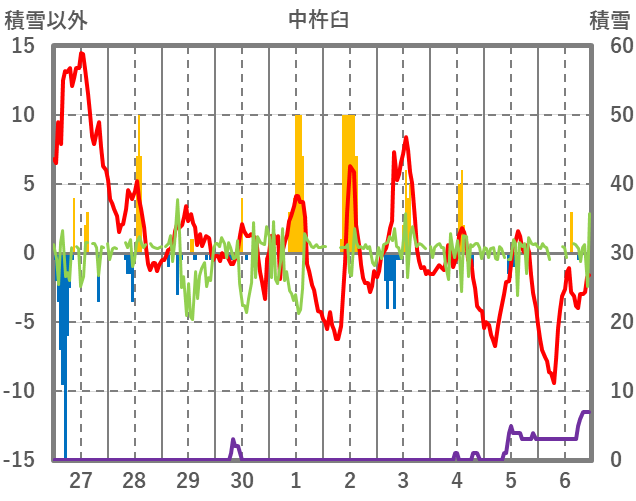 | 日 | 時 | 気温 | 降水 | 風向/風速 | 日照 | 積雪 | 降雪 |
