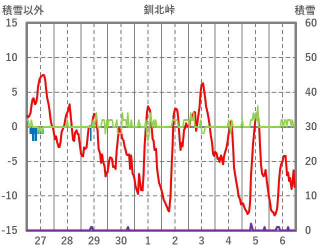 | 日 | 時 | 気温 | 降水 | 風向/風速 | 日照 | 積雪 | 降雪 |