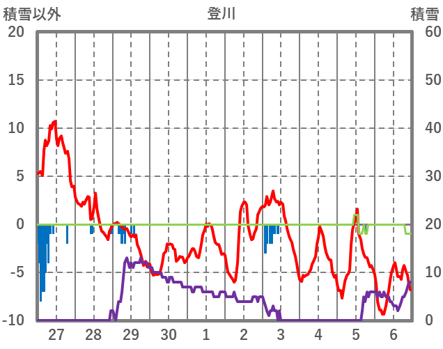 | 日 | 時 | 気温 | 降水 | 風向/風速 | 日照 | 積雪 | 降雪 |
