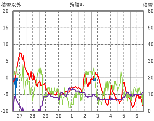 | 日 | 時 | 気温 | 降水 | 風向/風速 | 日照 | 積雪 | 降雪 |