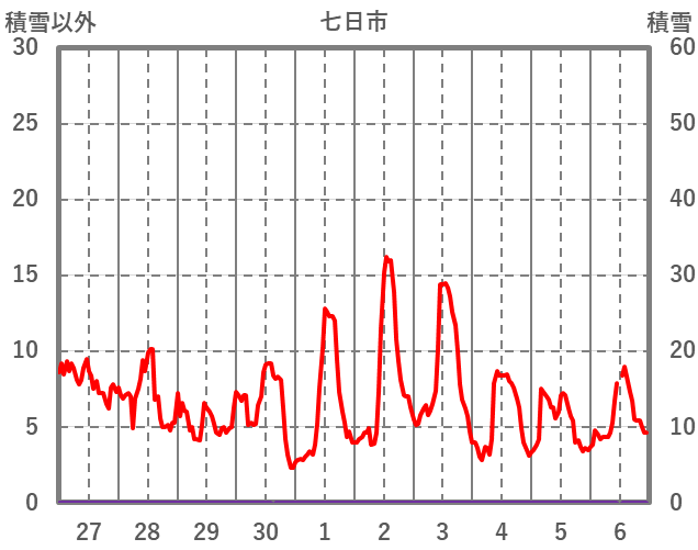 | 日 | 時 | 気温 | 降水 | 風向/風速 | 日照 | 積雪 | 降雪 |