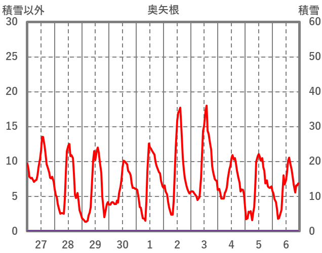 | 日 | 時 | 気温 | 降水 | 風向/風速 | 日照 | 積雪 | 降雪 |