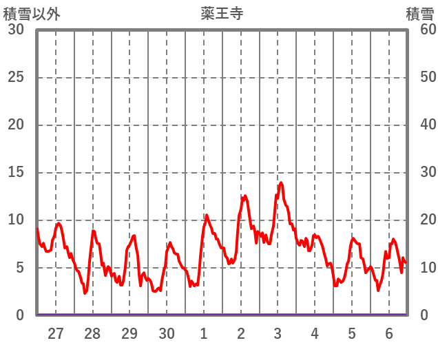 | 日 | 時 | 気温 | 降水 | 風向/風速 | 日照 | 積雪 | 降雪 |