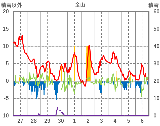 | 日 | 時 | 気温 | 降水 | 風向/風速 | 日照 | 積雪 | 降雪 |