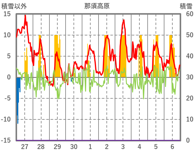| 日 | 時 | 気温 | 降水 | 風向/風速 | 日照 | 積雪 | 降雪 |