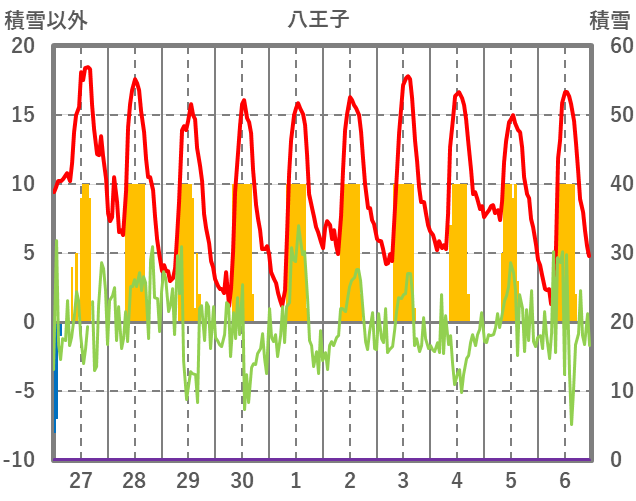 | 日 | 時 | 気温 | 降水 | 風向/風速 | 日照 | 積雪 | 降雪 |