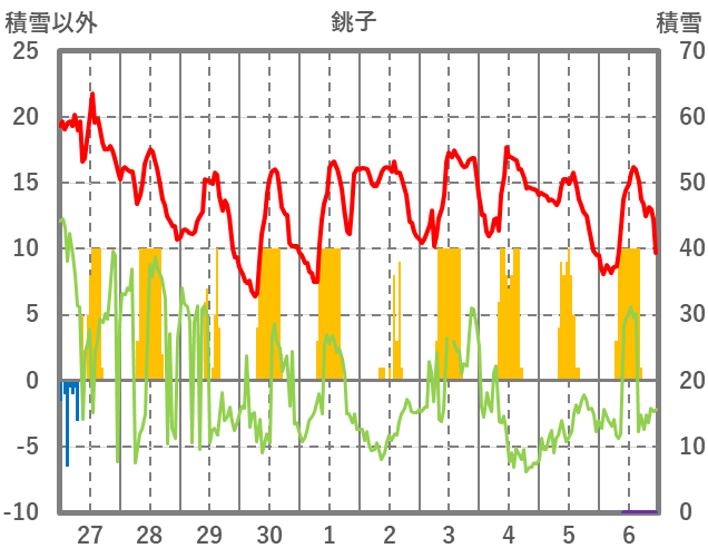 | 日 | 時 | 気温 | 降水 | 風向/風速 | 日照 | 積雪 | 降雪 |