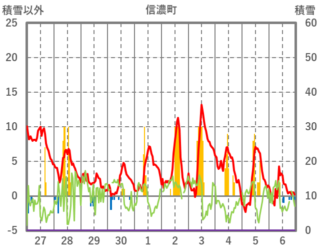| 日 | 時 | 気温 | 降水 | 風向/風速 | 日照 | 積雪 | 降雪 |