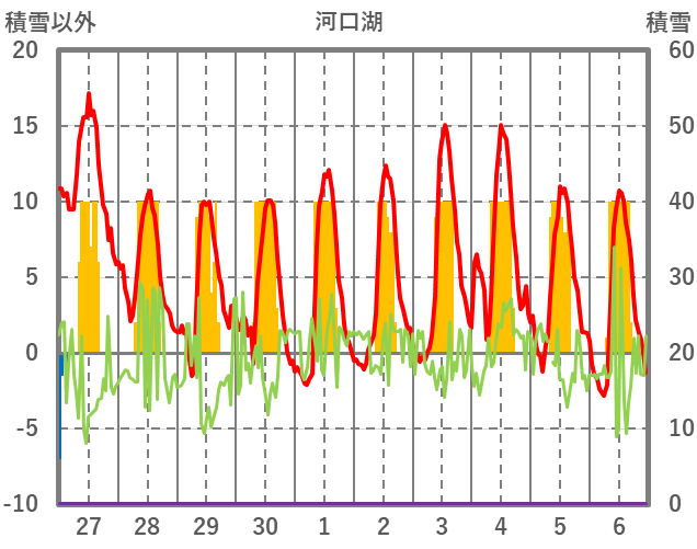 | 日 | 時 | 気温 | 降水 | 風向/風速 | 日照 | 積雪 | 降雪 |