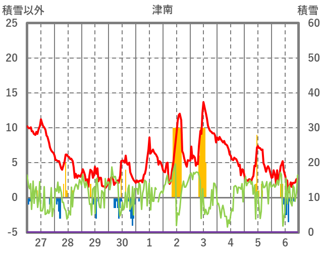 | 日 | 時 | 気温 | 降水 | 風向/風速 | 日照 | 積雪 | 降雪 |